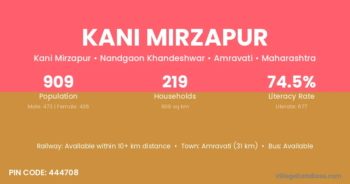 Amravati (31 km) is the nearest town to Kani Mirzapur village for major economic activities and is located approximately 31 km away.