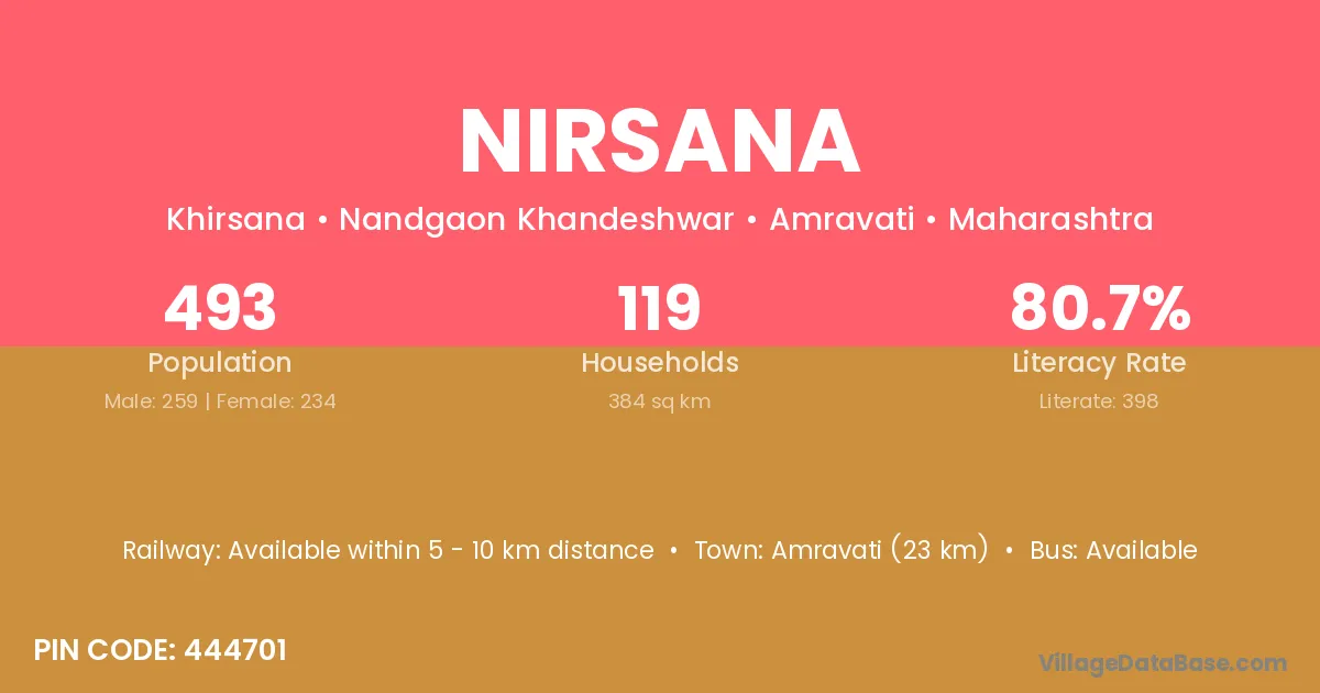 Amravati (23 km) is the nearest town to Nirsana village for major economic activities and is located approximately 23 km away.