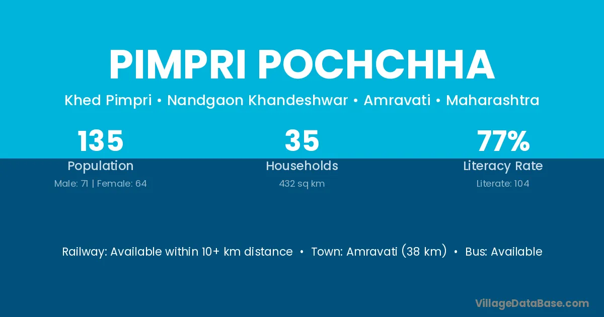 Amravati (38 km) is the nearest town to Pimpri Pochchha village for major economic activities and is located approximately 38 km away.