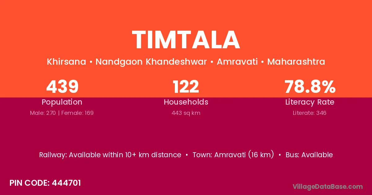 Amravati (16 km) is the nearest town to Timtala village for major economic activities and is located approximately 16 km away.