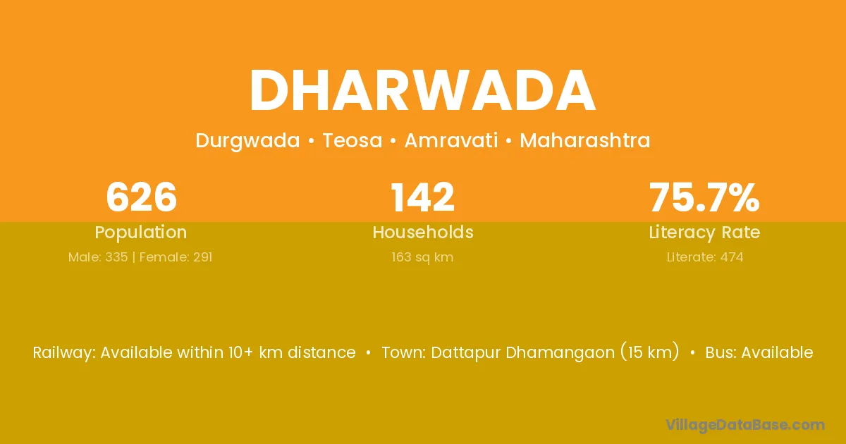 Dattapur Dhamangaon (15 km) is the nearest town to Dharwada village for major economic activities and is located approximately 15 km away.