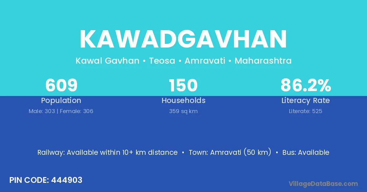 Kawadgavhan village has a total population of 609 people, of which 303 are males and 306 are females.