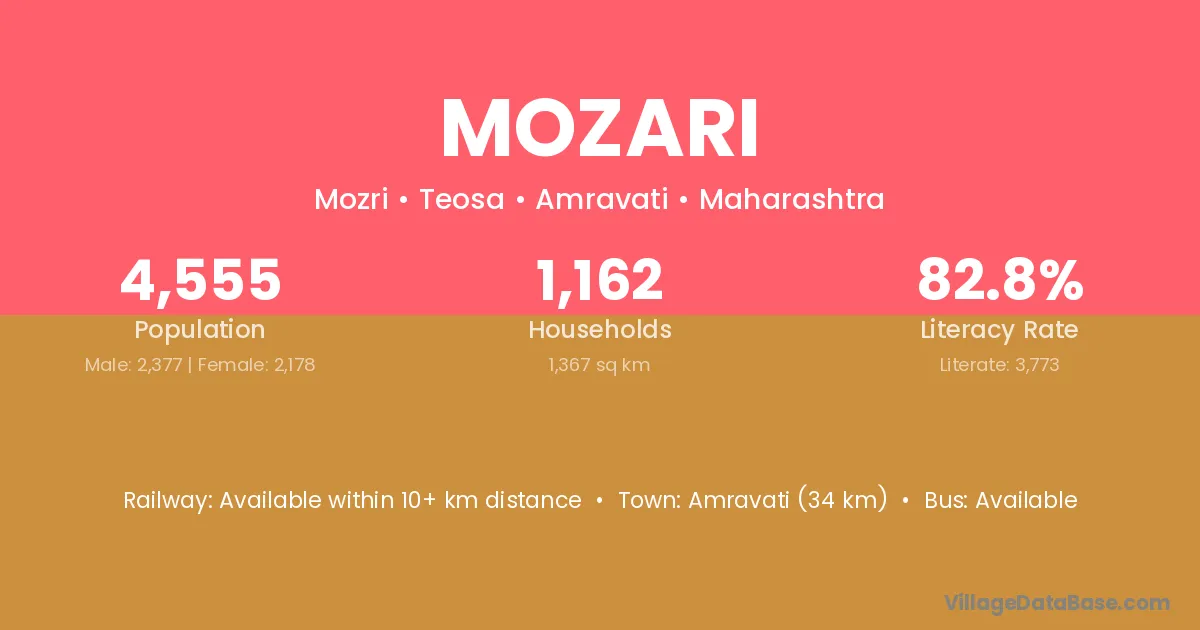 Amravati (34 km) is the nearest town to Mozari village for major economic activities and is located approximately 34 km away.