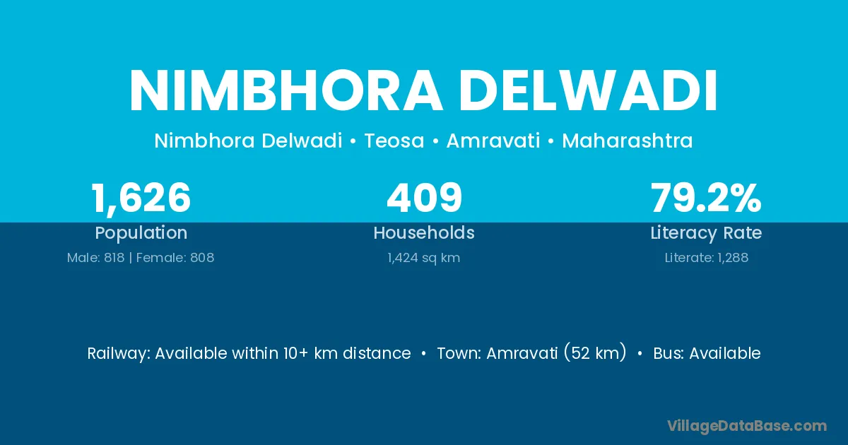 Amravati (52 km) is the nearest town to Nimbhora Delwadi village for major economic activities and is located approximately 52 km away.