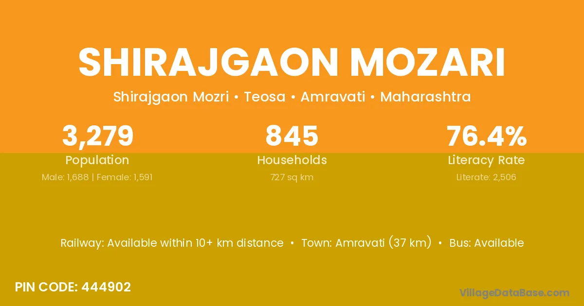 Amravati (37 km) is the nearest town to Shirajgaon Mozari village for major economic activities and is located approximately 37 km away.
