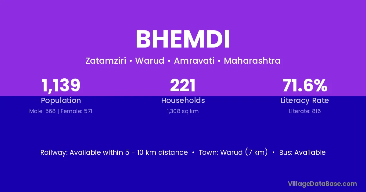 Warud (7 km) is the nearest town to Bhemdi village for major economic activities and is located approximately 7 km away.