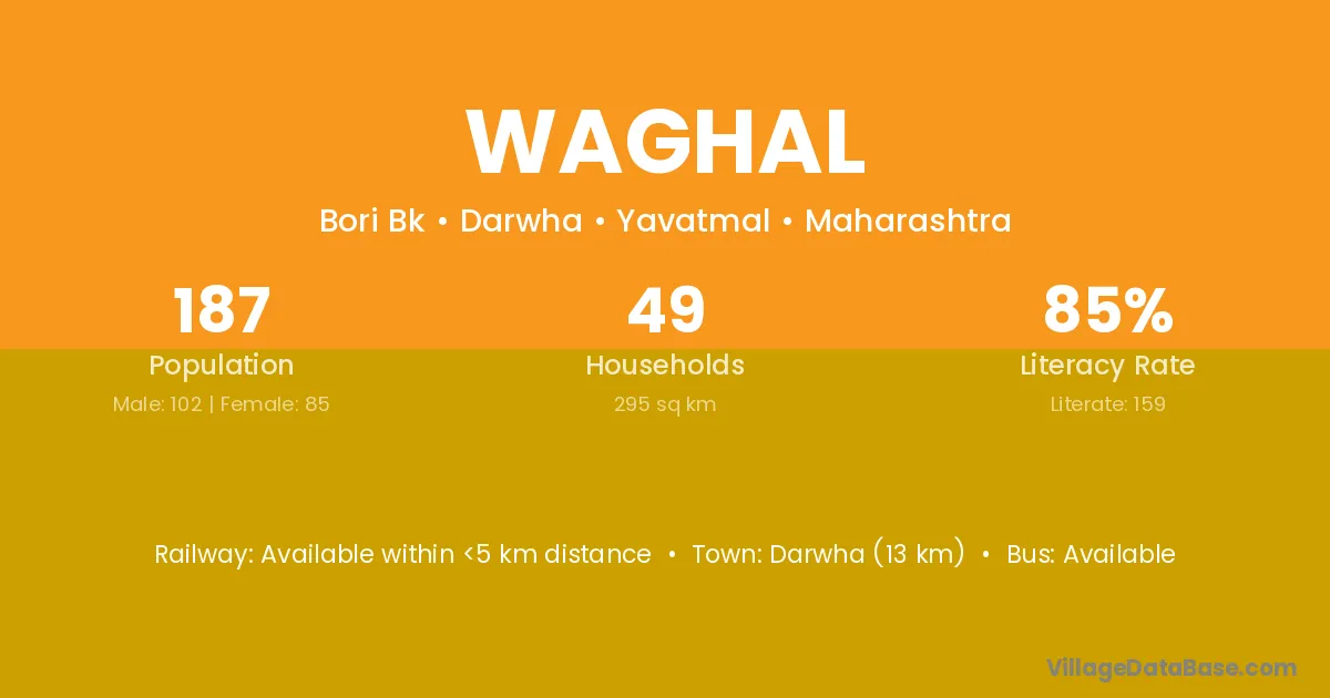 Warud (14 km) is the nearest town to Waghal village for major economic activities and is located approximately 14 km away.