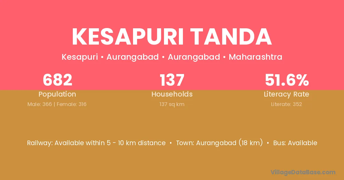 Kesapuri Tanda village has a total population of 682 people, of which 366 are males and 316 are females.