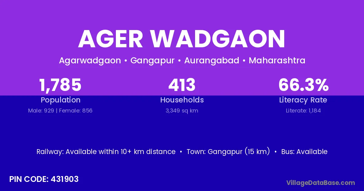 Gangapur (15 km) is the nearest town to Ager Wadgaon village for major economic activities and is located approximately 15 km away.