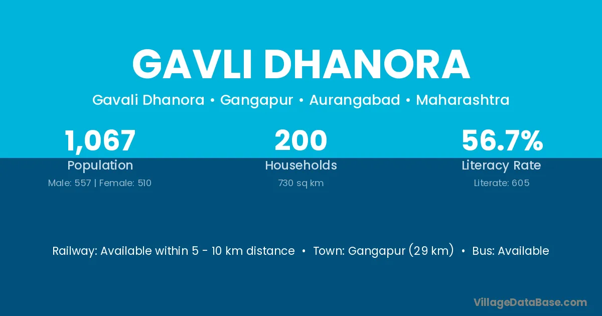 Gangapur (29 km) is the nearest town to Gavli Dhanora village for major economic activities and is located approximately 29 km away.