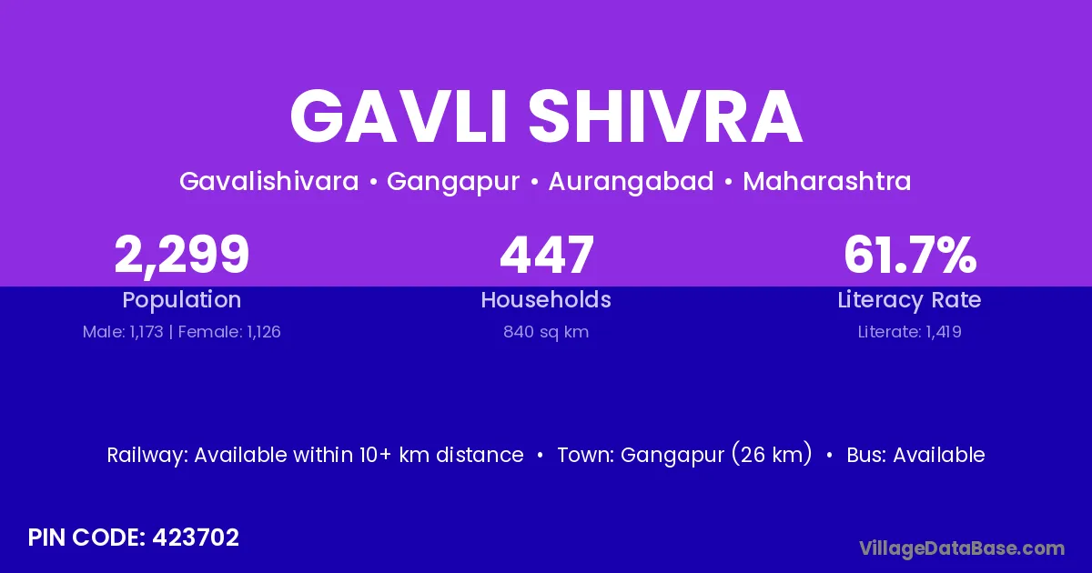 Gangapur (26 km) is the nearest town to Gavli Shivra village for major economic activities and is located approximately 26 km away.