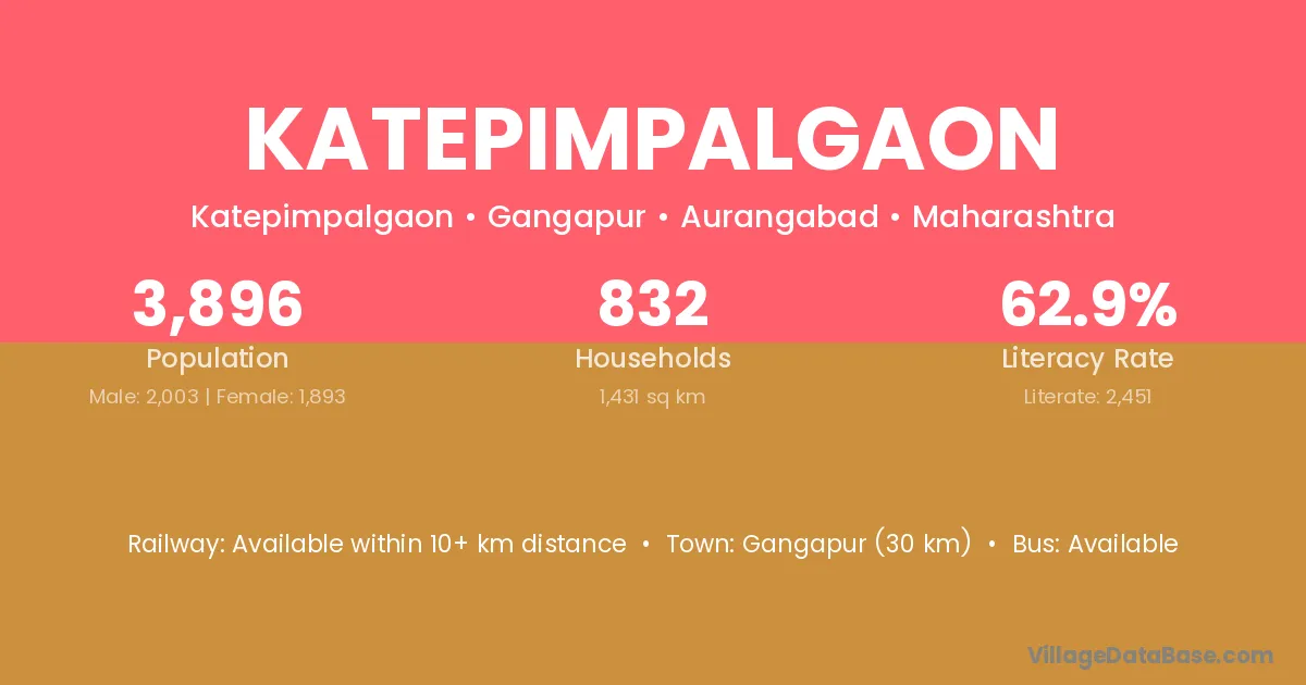 Katepimpalgaon village has a total population of 3,896 people, of which 2,003 are males and 1,893 are females.