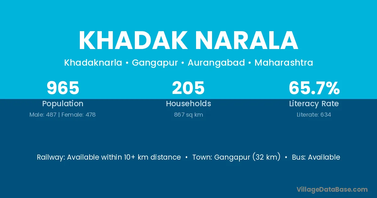 Gangapur (32 km) is the nearest town to Khadak Narala village for major economic activities and is located approximately 32 km away.