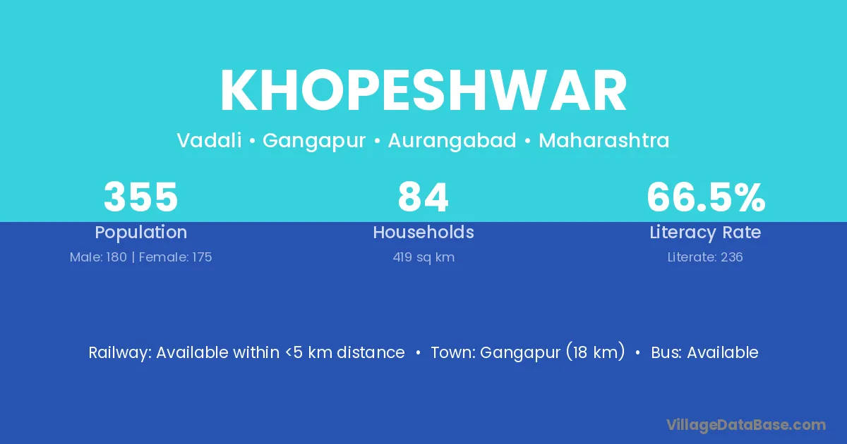 Gangapur (18 km) is the nearest town to Khopeshwar village for major economic activities and is located approximately 18 km away.