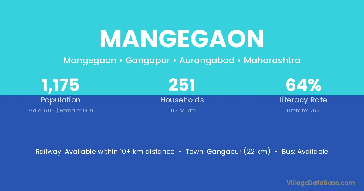 Gangapur (22 km) is the nearest town to Mangegaon village for major economic activities and is located approximately 22 km away.