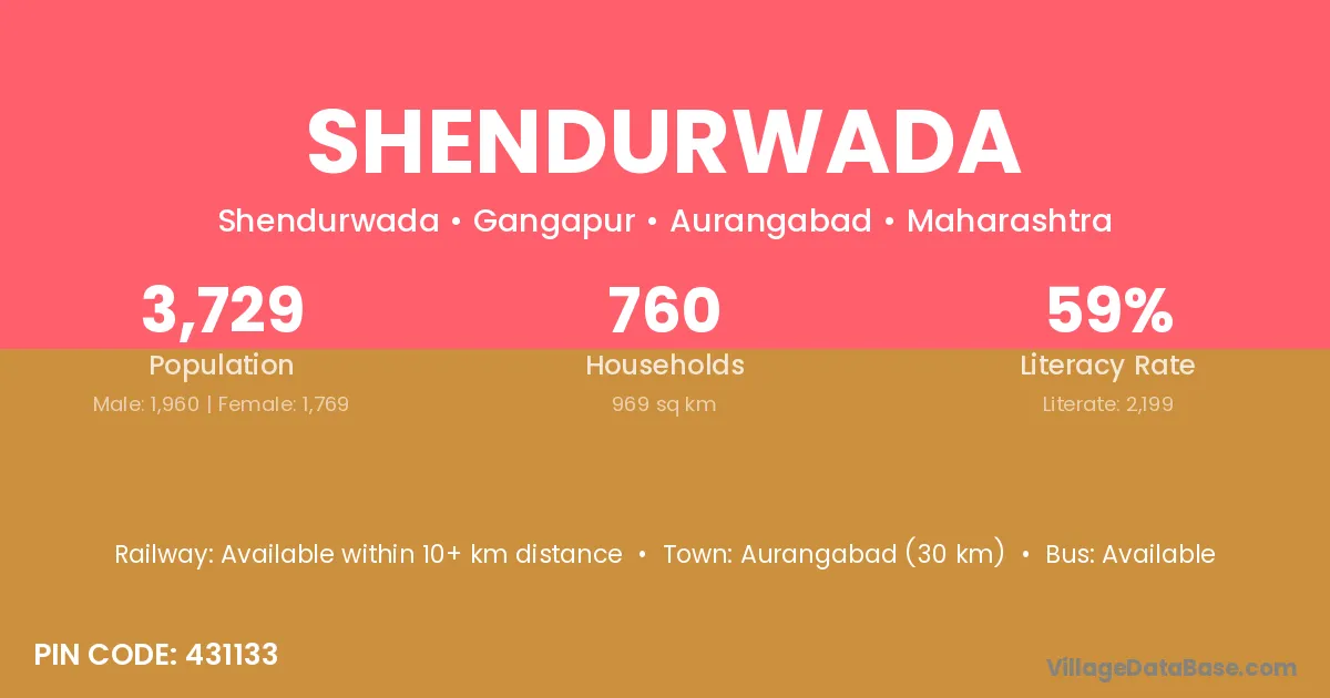 Shendurwada village has a total population of 3,729 people, of which 1,960 are males and 1,769 are females.
