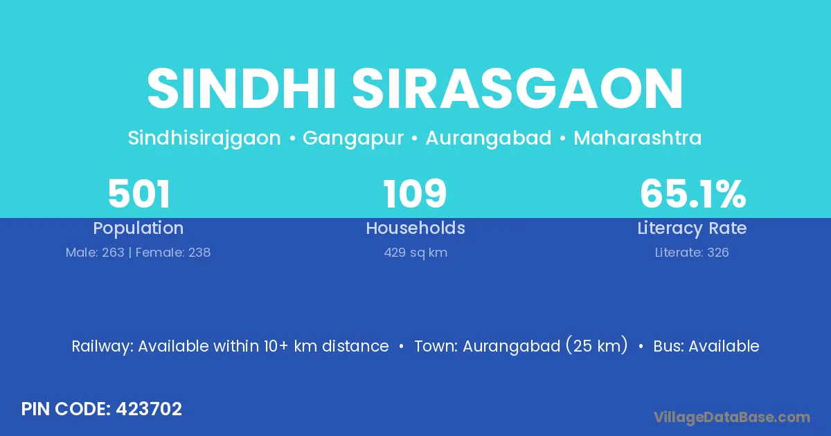 Sindhi Sirasgaon village has a total population of 501 people, of which 263 are males and 238 are females.