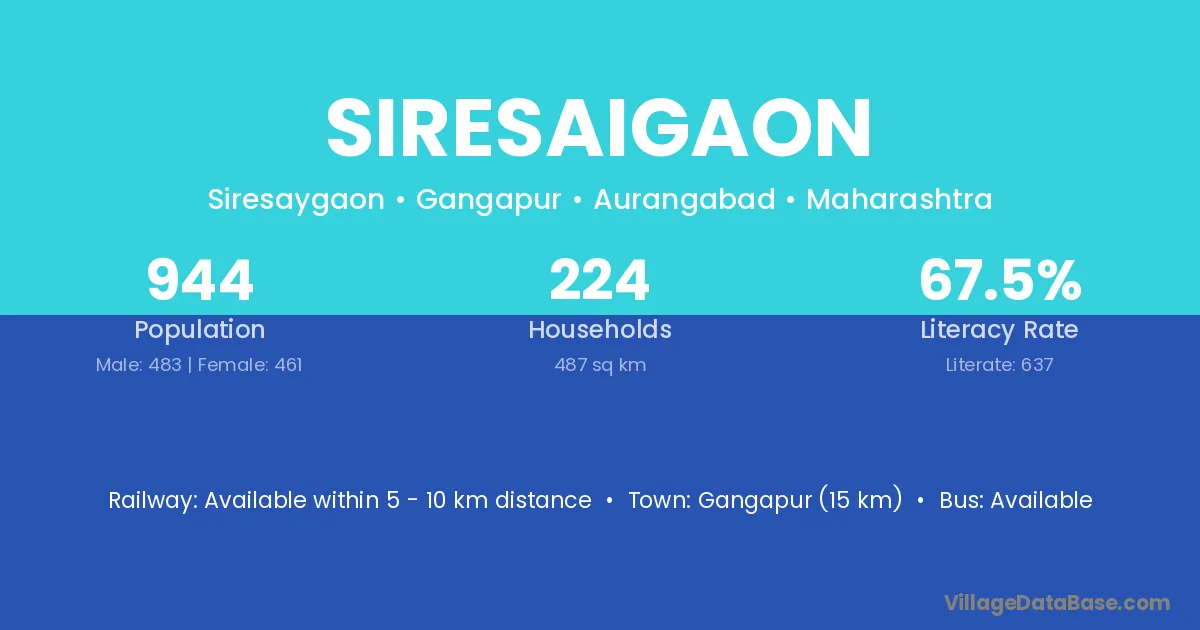 Gangapur (15 km) is the nearest town to Siresaigaon village for major economic activities and is located approximately 15 km away.