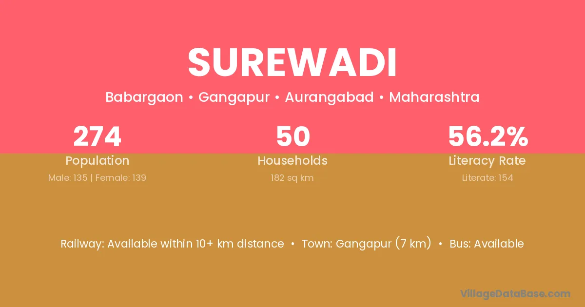 Surewadi village has a total population of 274 people, of which 135 are males and 139 are females.