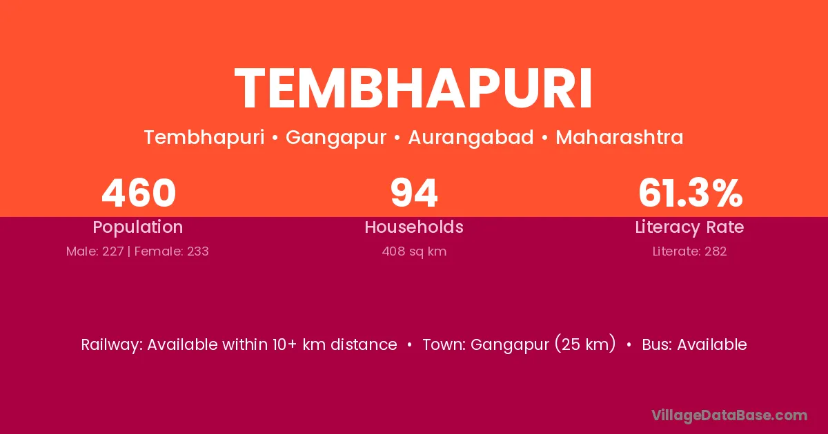 Tembhapuri village has a total population of 460 people, of which 227 are males and 233 are females.