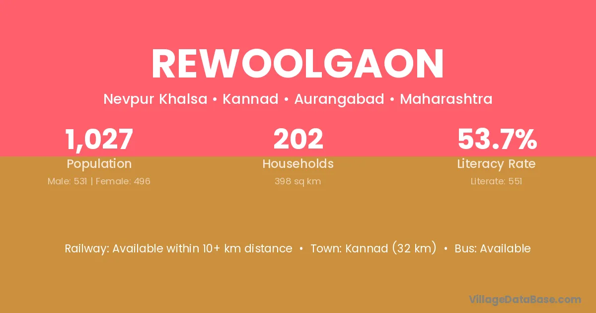 Kannad (32 km) is the nearest town to Rewoolgaon village for major economic activities and is located approximately 32 km away.