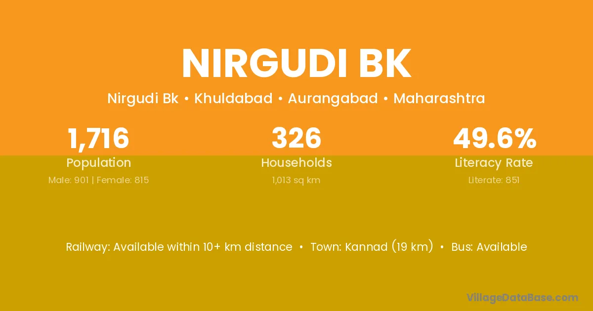 Kannad (19 km) is the nearest town to Nirgudi Bk village for major economic activities and is located approximately 19 km away.