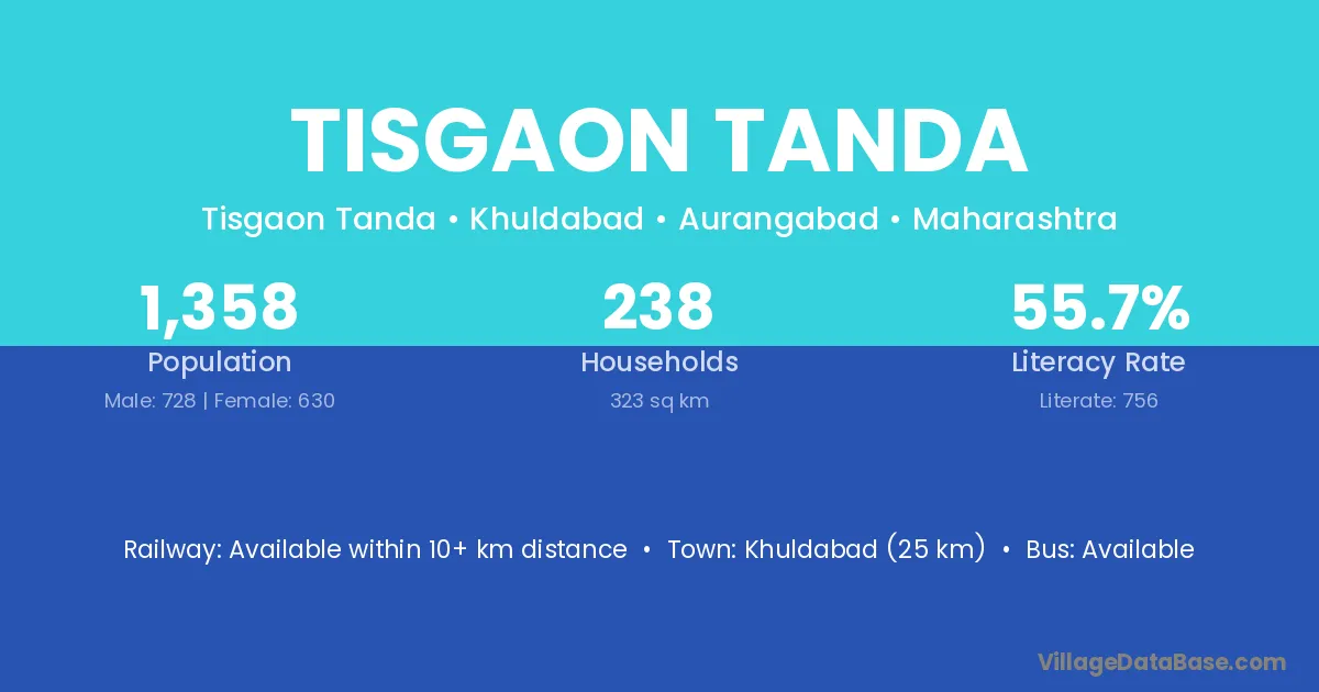Khuldabad (25 km) is the nearest town to Tisgaon Tanda village for major economic activities and is located approximately 25 km away.