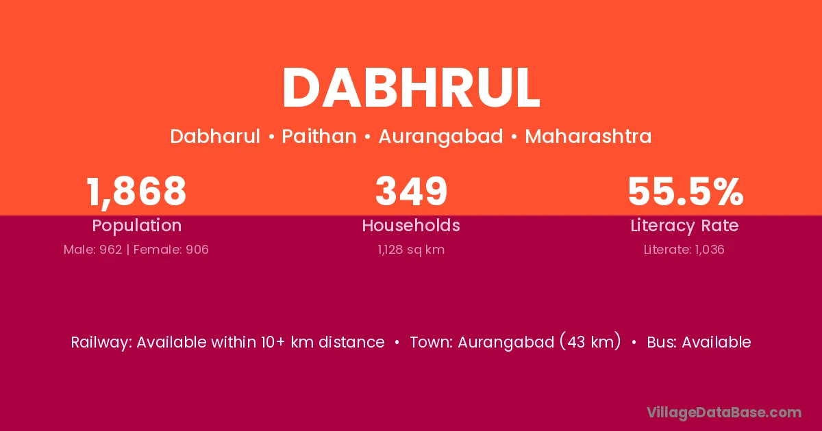 Aurangabad (43 km) is the nearest town to Dabhrul village for major economic activities and is located approximately 43 km away.