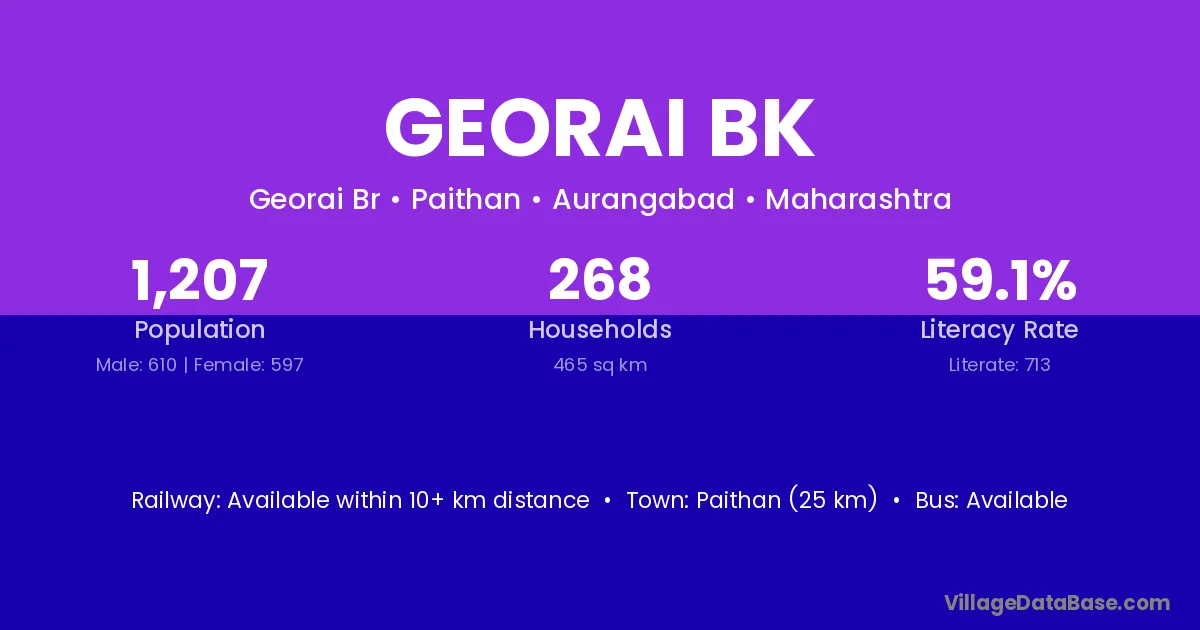 Georai Bk village has a total population of 1,207 people, of which 610 are males and 597 are females.