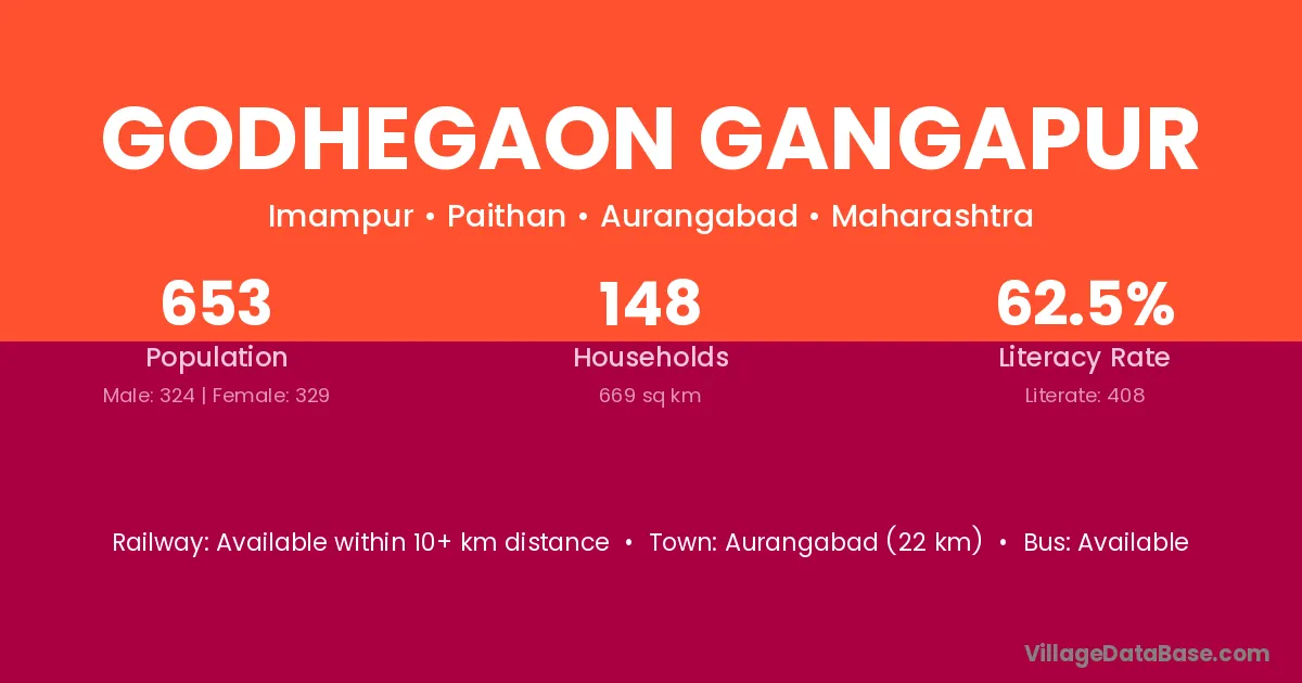 Godhegaon Gangapur village has a total population of 653 people, of which 324 are males and 329 are females.