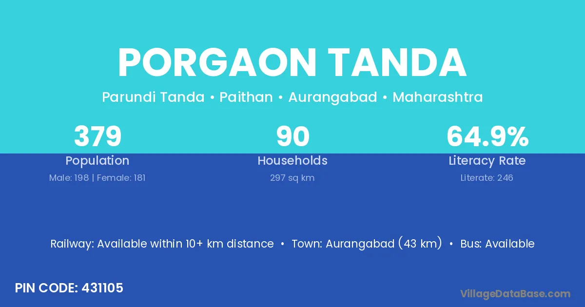 Aurangabad (43 km) is the nearest town to Porgaon Tanda village for major economic activities and is located approximately 43 km away.