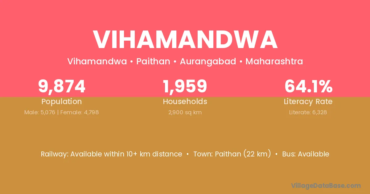 Paithan (22 km) is the nearest town to Vihamandwa village for major economic activities and is located approximately 22 km away.