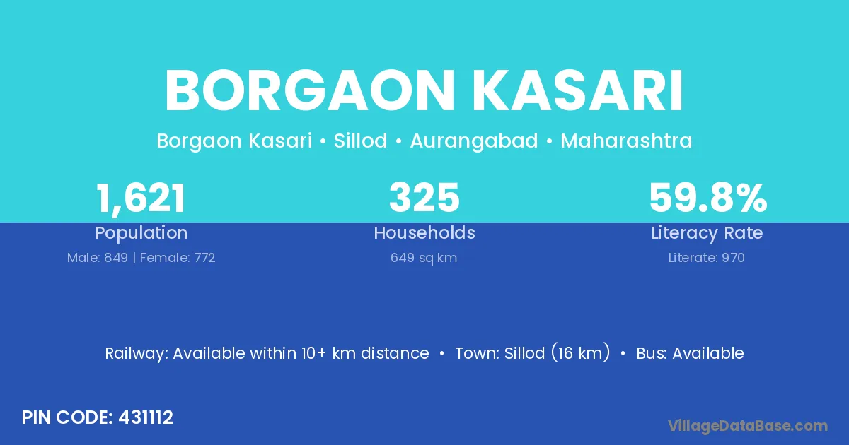 Sillod (16 km) is the nearest town to Borgaon Kasari village for major economic activities and is located approximately 16 km away.