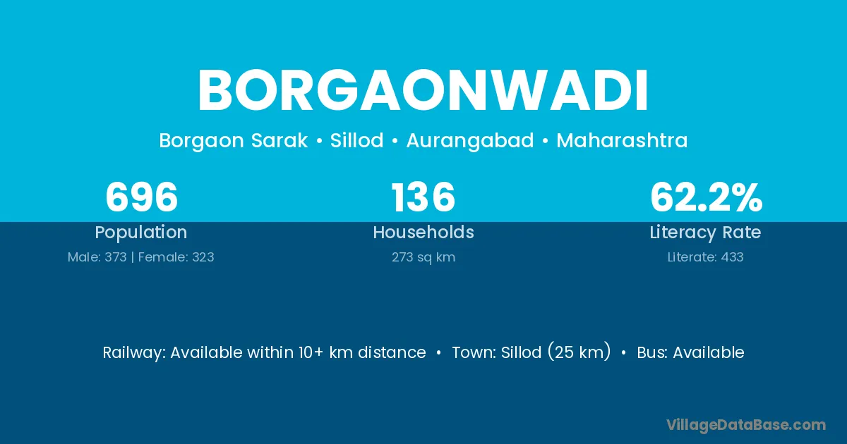 Sillod (25 km) is the nearest town to Borgaonwadi village for major economic activities and is located approximately 25 km away.