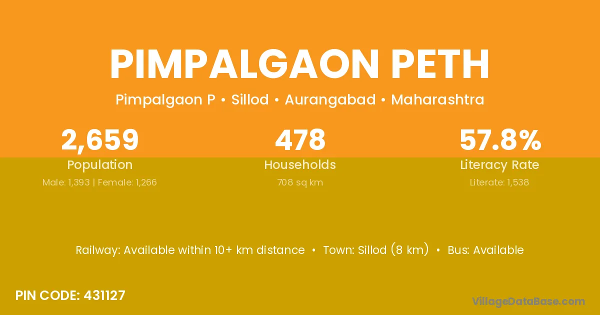 Sillod (8 km) is the nearest town to Pimpalgaon Peth village for major economic activities and is located approximately 8 km away.