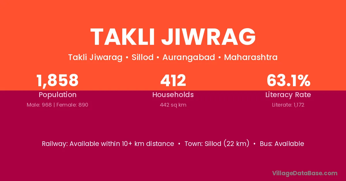 Sillod (22 km) is the nearest town to Takli Jiwrag village for major economic activities and is located approximately 22 km away.