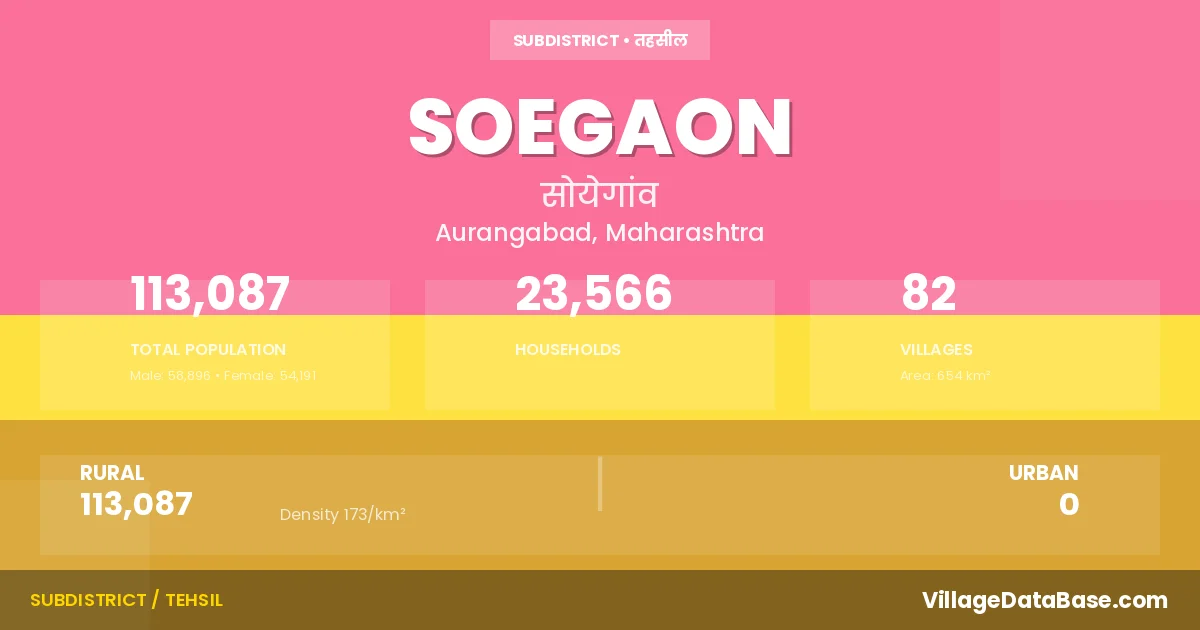 According to the 2011 census The total area of Soegaon Tehsil is 654 km², with a population of 113087 people. The population density is 173 inhabitants per square kilometre, and there are approximately 23566 houses in the sub district.