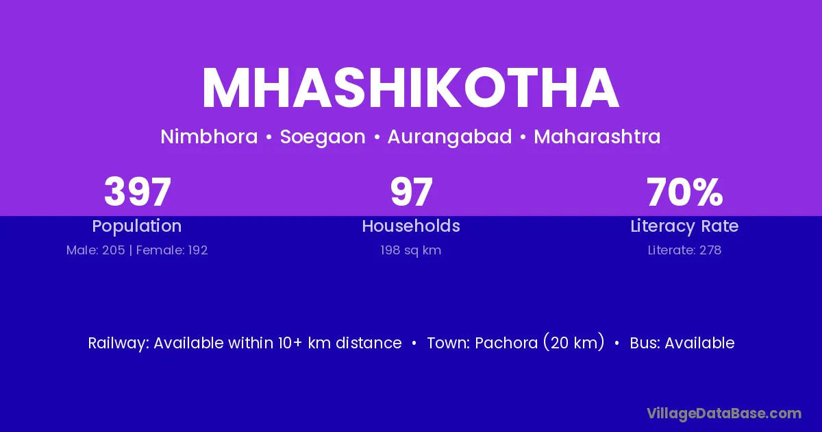 Mhashikotha village has a total population of 397 people, of which 205 are males and 192 are females.