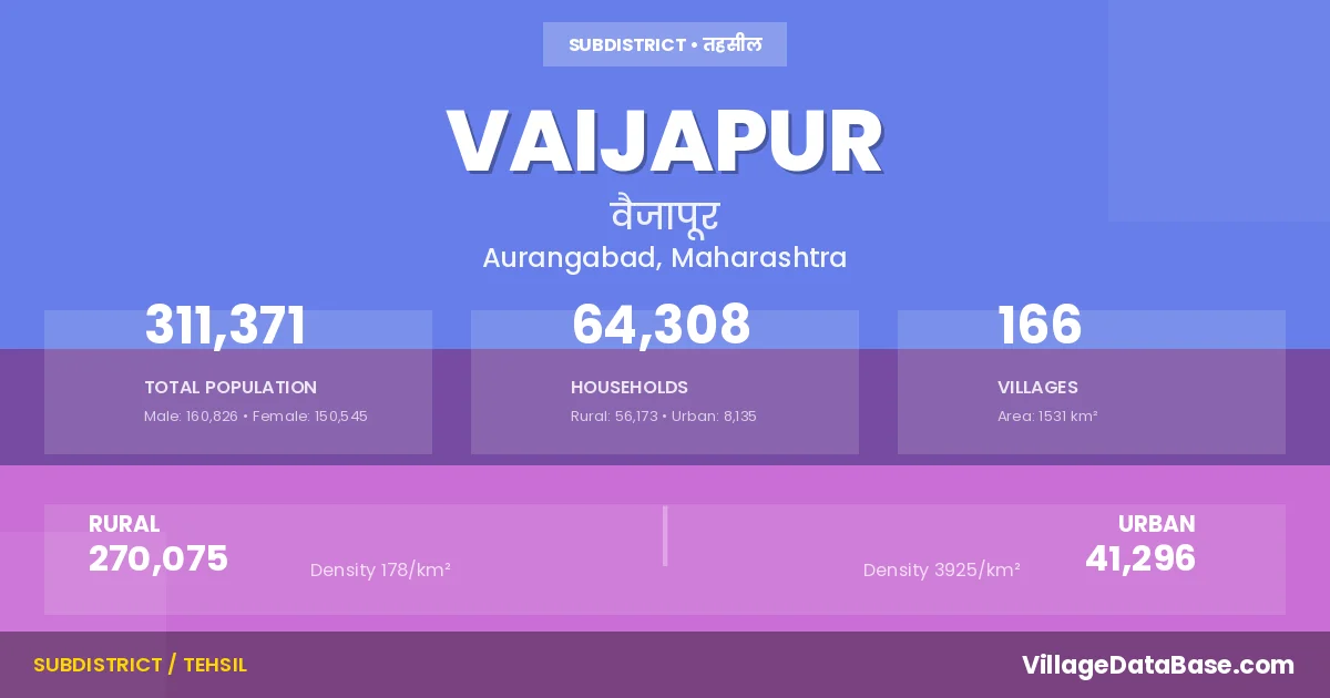 According to the 2011 census The total area of Vaijapur Tehsil is 1531 km², with a population of 311371 people. The population density is 203 inhabitants per square kilometre, and there are approximately 64308 houses in the sub district.
