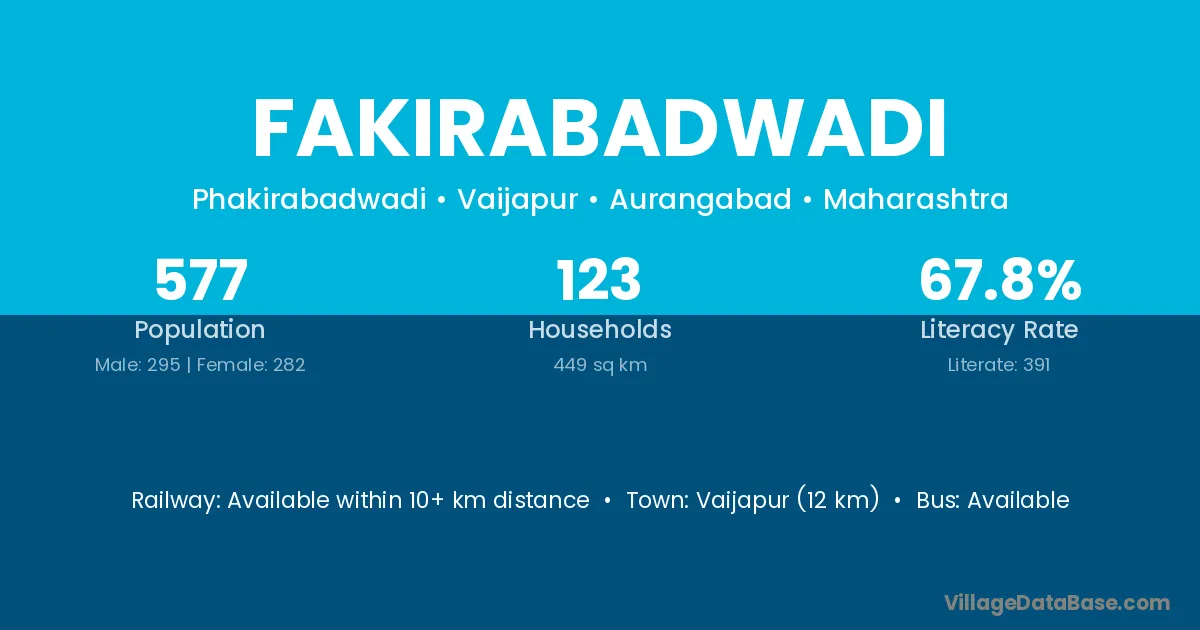 Vaijapur (12 km) is the nearest town to Fakirabadwadi village for major economic activities and is located approximately 12 km away.