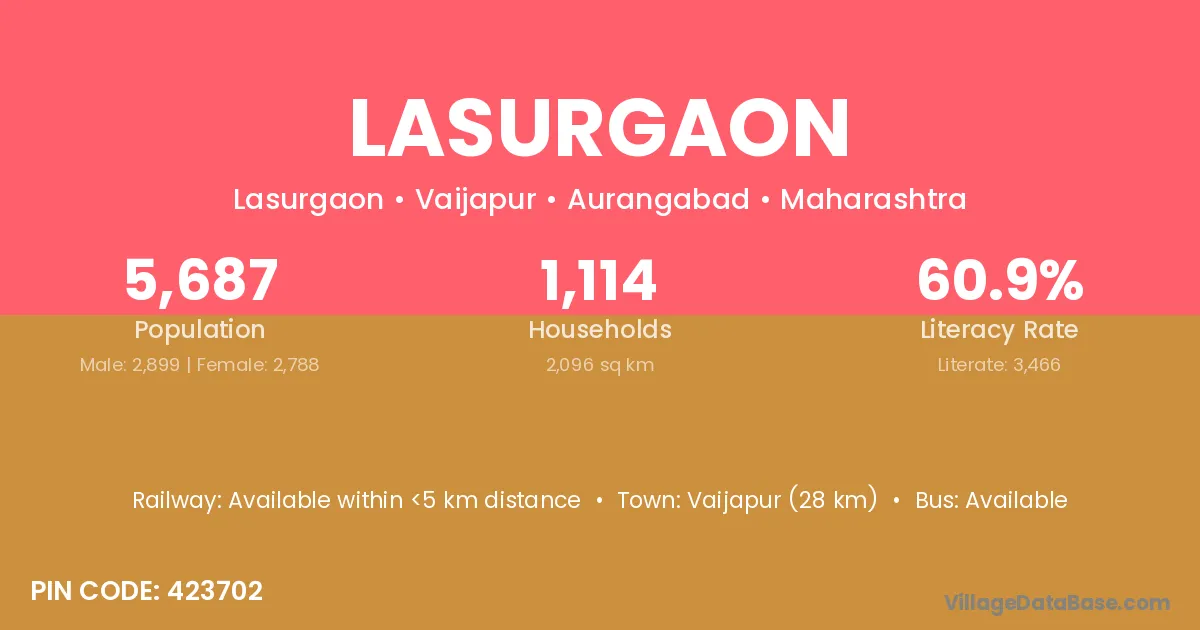 Vaijapur (28 km) is the nearest town to Lasurgaon village for major economic activities and is located approximately 28 km away.
