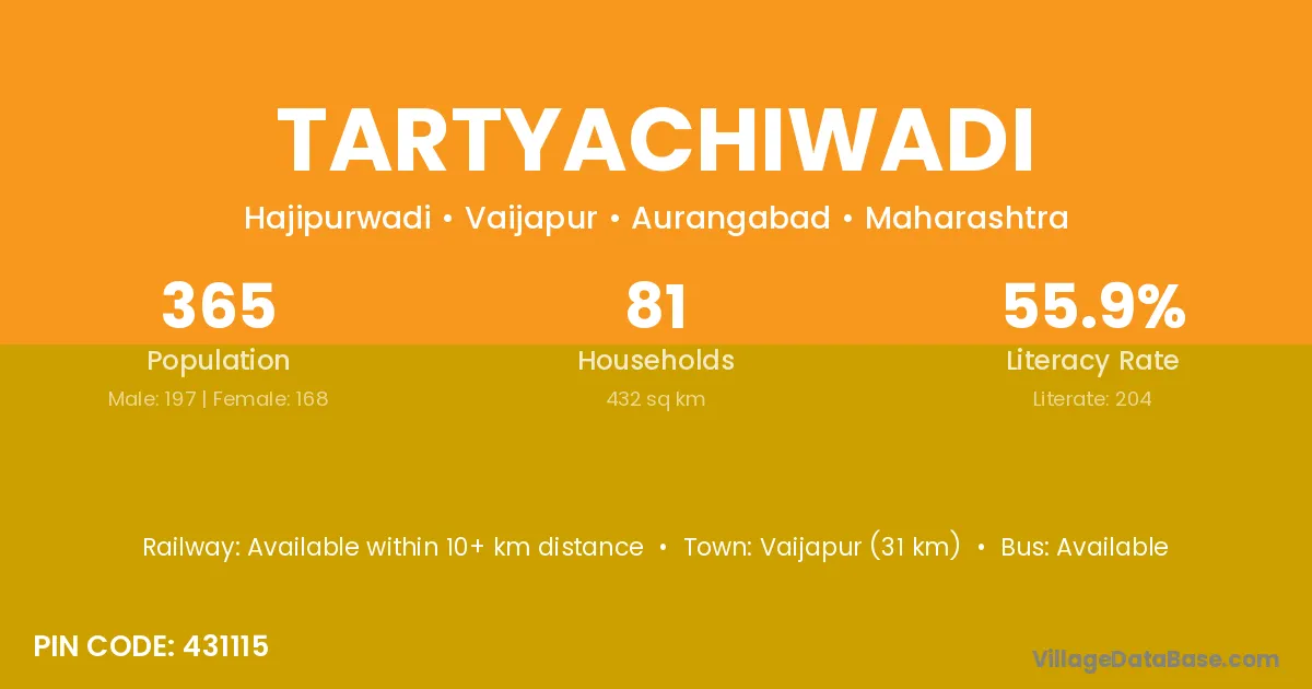 Vaijapur (31 km) is the nearest town to Tartyachiwadi village for major economic activities and is located approximately 31 km away.