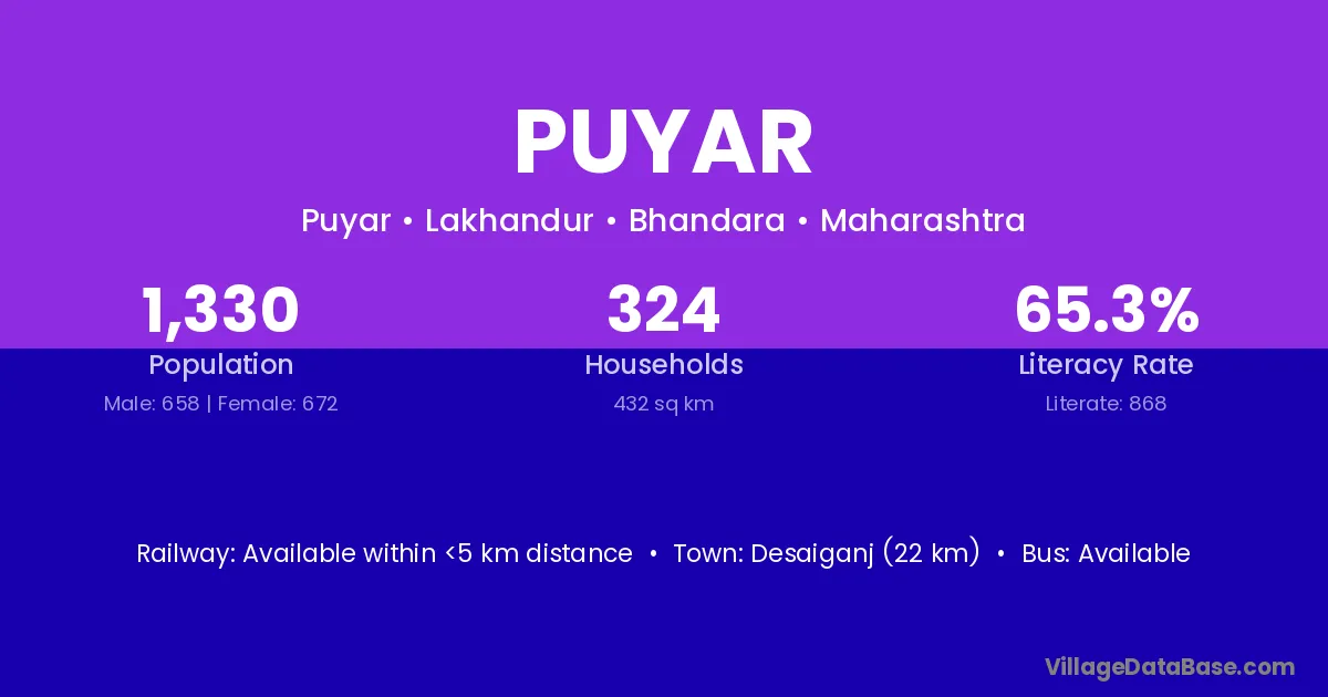 Desaiganj (22 km) is the nearest town to Puyar village for major economic activities and is located approximately 22 km away.