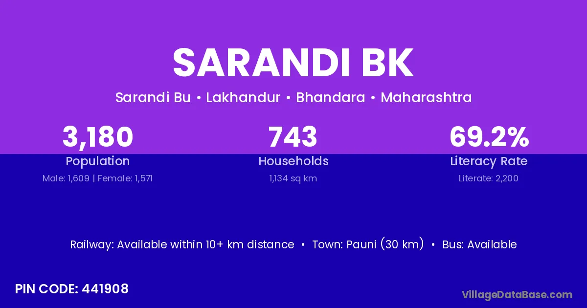 Pauni (30 km) is the nearest town to Sarandi Bk village for major economic activities and is located approximately 30 km away.
