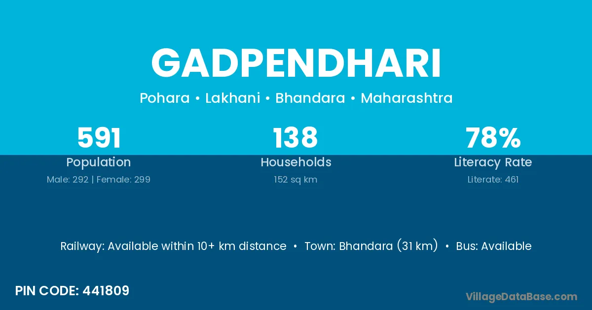 Bhandara (31 km) is the nearest town to Gadpendhari village for major economic activities and is located approximately 31 km away.