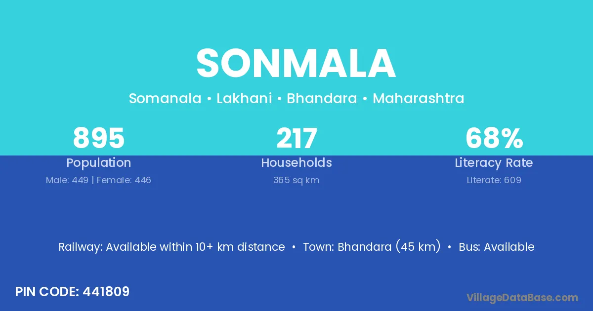 Bhandara (45 km) is the nearest town to Sonmala village for major economic activities and is located approximately 45 km away.
