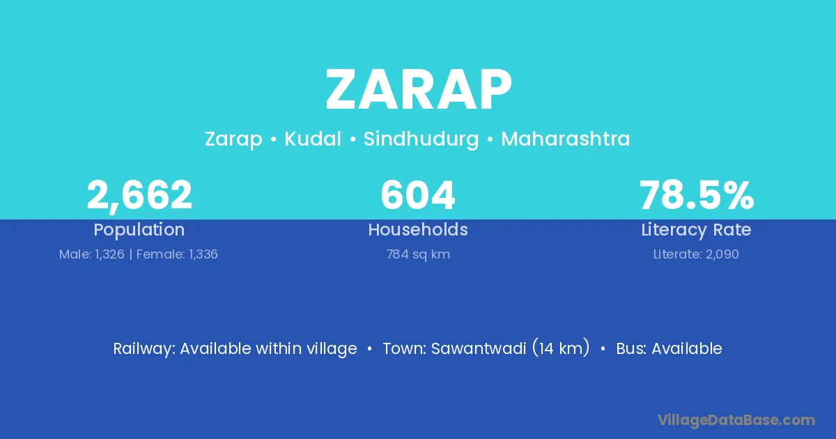 The literacy rate of Zarap village is 73.24%. Male literacy stands at 79.41% and female literacy at 67.57%.