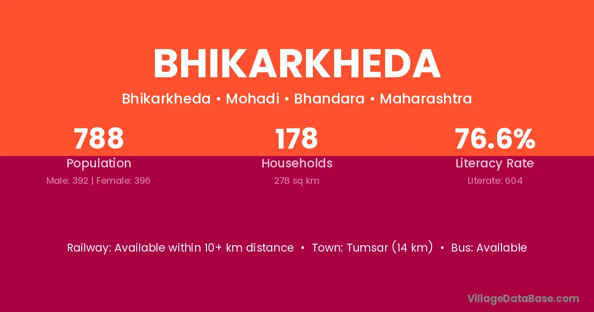 Tumsar (14 km) is the nearest town to Bhikarkheda village for major economic activities and is located approximately 14 km away.