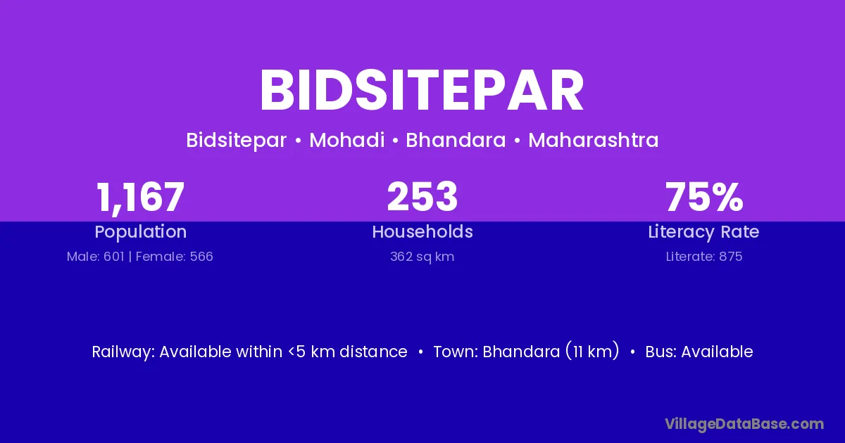 Bhandara (11 km) is the nearest town to Bidsitepar village for major economic activities and is located approximately 11 km away.