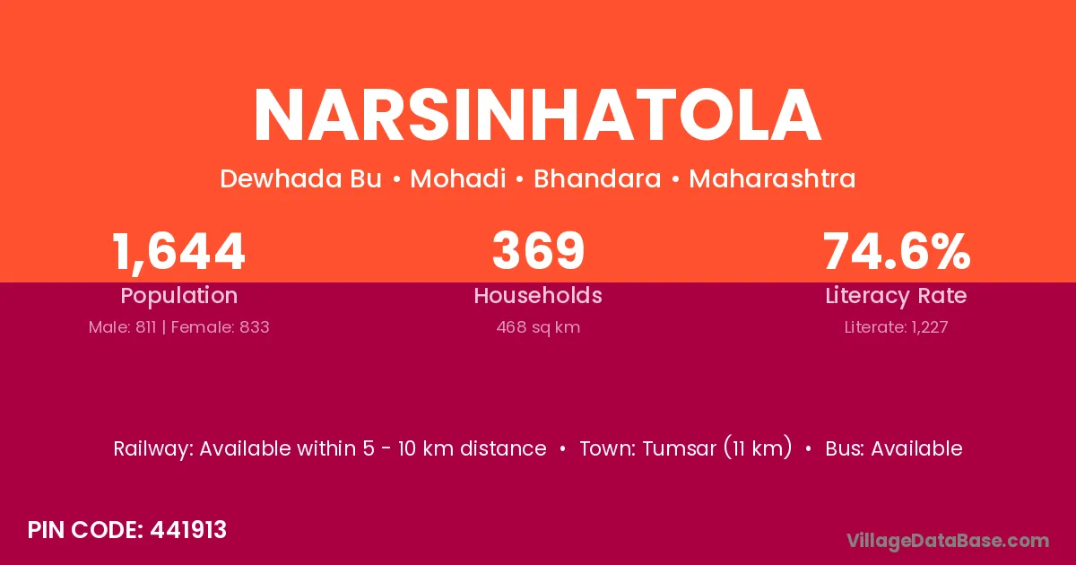 Tumsar (11 km) is the nearest town to Narsinhatola village for major economic activities and is located approximately 11 km away.
